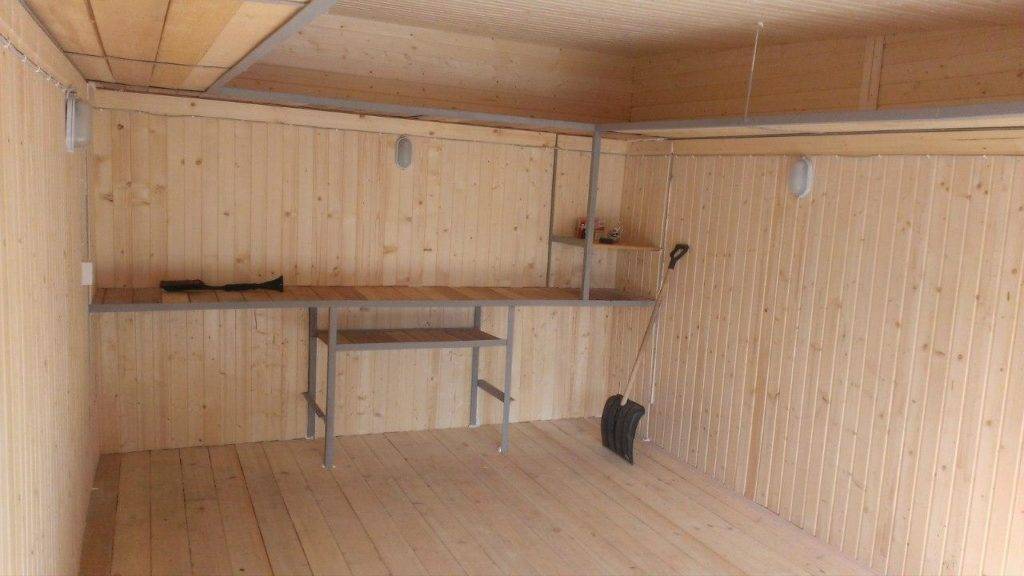 Среди минусов вагонки особо выделяют слабую прочность и значительное сужение пространства внутри гаража, минимум на 8 сантиметров. Придется также следить за расположением обрешетки, потому что только на ней вы потом сможете сделать крепления для шкафчиков, полок и антресолей.