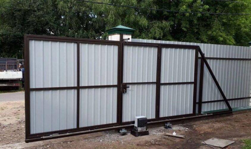 Если забор короче, следует делать две створки ворот с двумя противовесами и комплектами автоматики. Это увеличивает стоимость откатных ворот, но позволит «поместиться» в заданные размеры (длину забора рядом с воротами). В противном случае нужно устанавливать распашные ворота из профнастила.