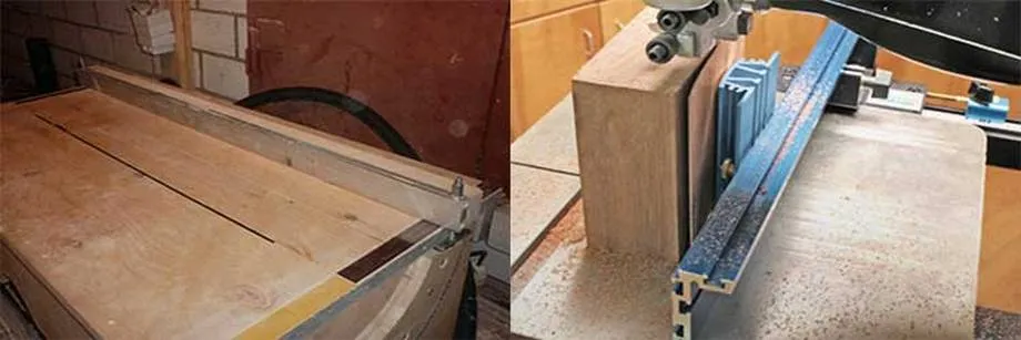 - Два куска древесины жестко закрепленных на каретке и сбоку циркулярного стола решают эту задачу, рисунок 1.