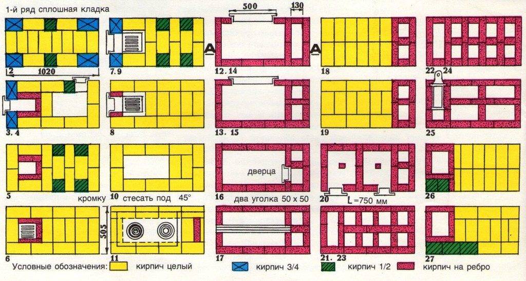 Последовательность кладки простой кирпичной печки для гаража, размеры 60х60 см, этого вполне достаточно для стандартного гаража: