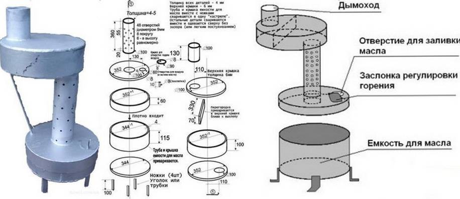 Изготавливается отопитель на отработанном масле своими руками из листового металла, трубы или бочки. Резервуар под топливо и верхняя камера могут иметь цилиндрическую или прямоугольную форму.