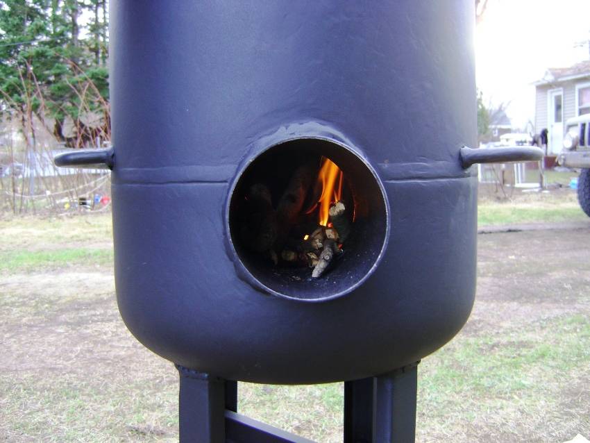 - В качестве корпуса можно использовать газовый баллон. Предварительно его очищают от краски, делают отверстия для дверец, устанавливают колосник.