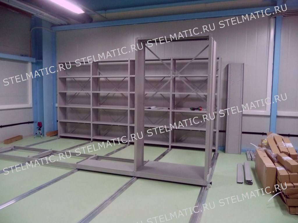 Стеллажи передвижные в основе своей конструкции имеют мобильное основание с механическим приводом, вертикальные стойки и горизонтальные полки. Стеллажи передвижные передвигаются благодаря их установке на рельсы, высота которых составляет примерно 3 см. Передвижные секции стеллажей при помощи ручного привода свободно перемещаются по направляющим путям, что обеспечивает доступ к любой нужной полке. Рельсы крепятся к полу шурупами или анкерами в зависимости от исполнения пола. Стеллажи передвижные дополнительно комплектуются стопорами, замками и т.д.