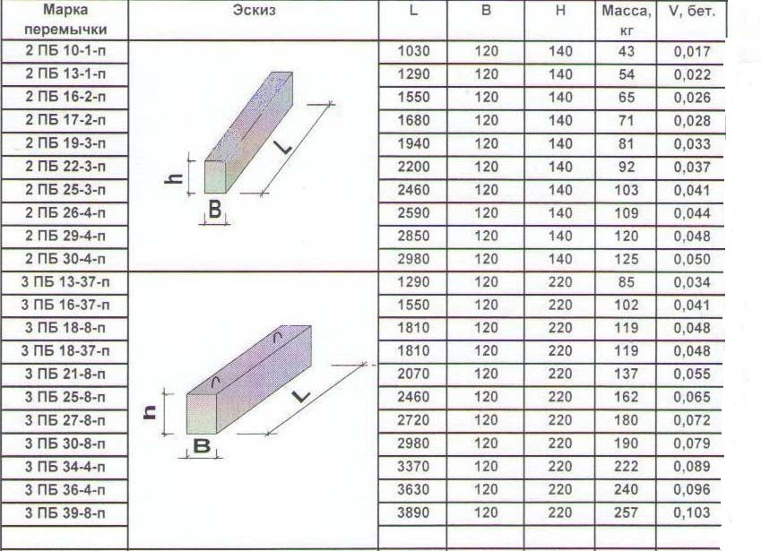 - Брусковые (ПБ) со стороной сечения не более 25 см. В зависимости от марки изделия, его длина может быть от 1030 до 5960 мм. Стандартизированная брусковая перемычка может иметь 10 разных длин, каждая из которых имеет два подвида с разной массой и системой армирования.