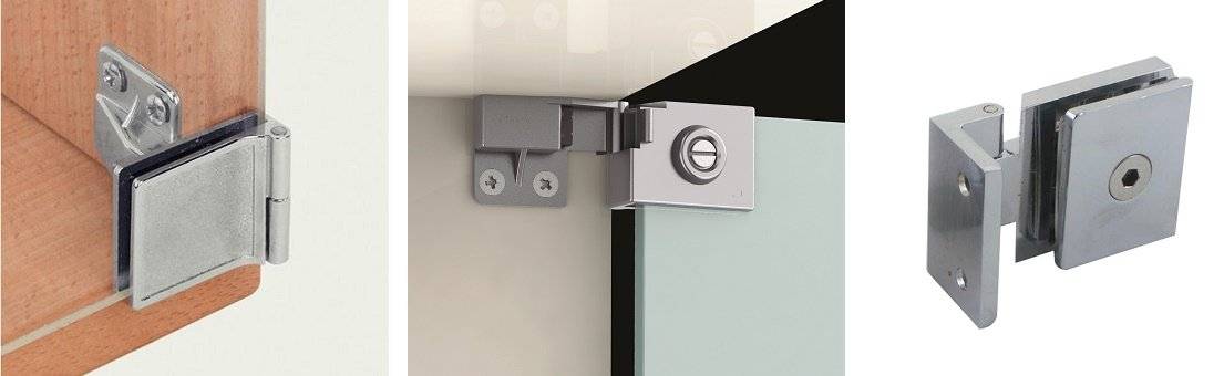 Разновидность мебельных петель без сверления того же накладного типа «посолидней» — шарнирные петли для стеклянных дверей. Также «накладываются» на край стеклянной створки и устанавливаются внутри ниши.