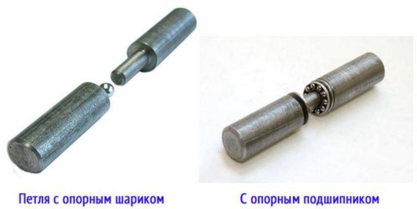 Такие шарниры имеют форму цилиндра, состоящего из двух частей. На верхней половине цилиндра есть штырь, на нижней — отверстие с подшипником. Верхняя часть со штырем вставляется в отверстие и опирается на подвижный шарик. За счет этого петли легко открываются и закрываются.
