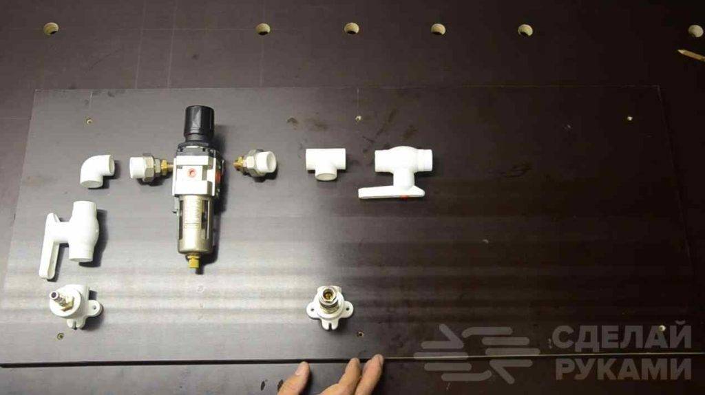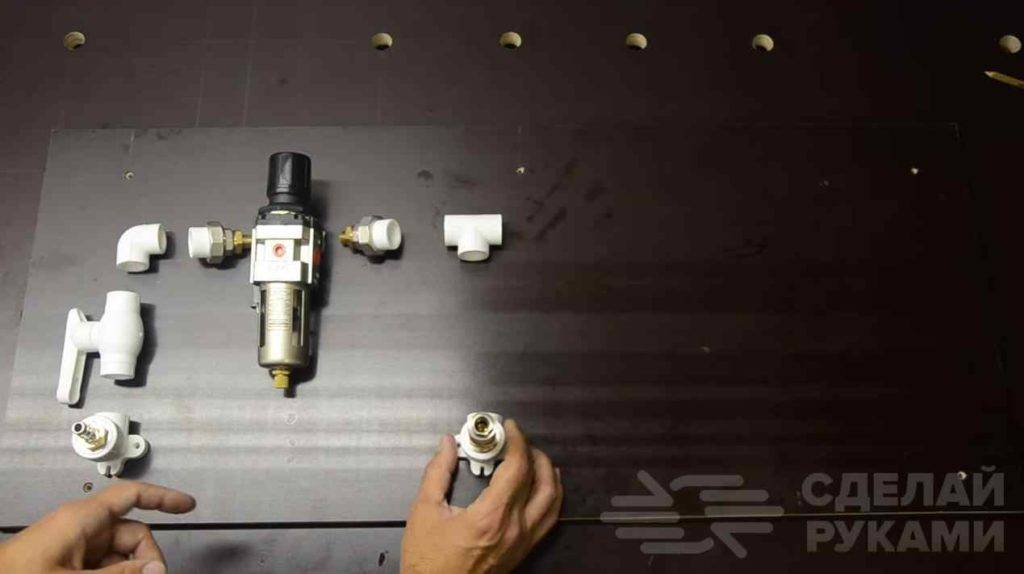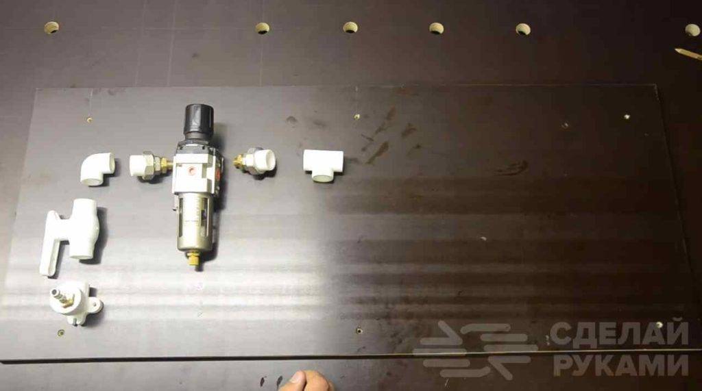 Первым звеном в пневмосистеме будет точка подключения компрессора к воздушной магистрали. Дальше автор решил установить кран — он нужен для того чтобы дальнейшем проверять герметичность системы.