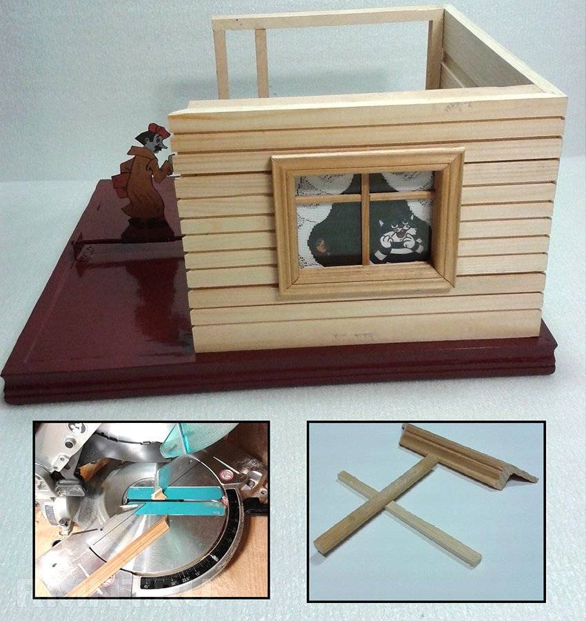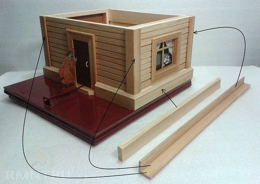 14. Внешние углы домика и нижнюю часть декорируем деревянными уголками.