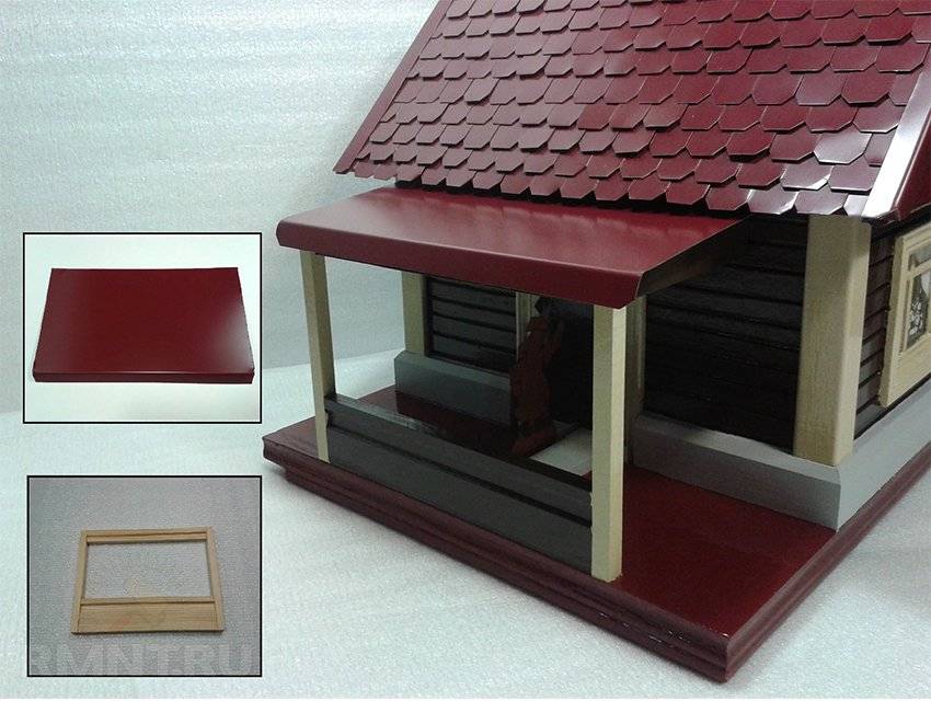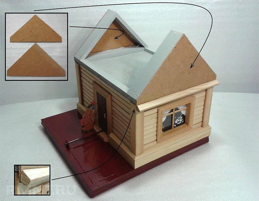 18. Фронтоны крыши изготавливаем из ДВП и приклеиваем отлив с фасадной стороны.