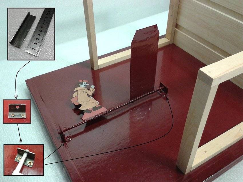 9. Фиксируем левую боковую стенку к каркасу и начинаем изготавливать сигнализатор. Он состоит из двух металлических пластин, соединенных между собой металлической осью и расположенных по отношению друг к другу в перпендикулярных плоскостях. Пластины фиксируем к оси с помощью металлических заклепок. На пластине, которая будет находиться снаружи почтового ящика, наносим тематический рисунок (почтальона), с помощью ножниц по металлу вырезаем по контуру рисунка и раскрашиваем акриловыми красками. Вторая пластина должна закрывать изнутри ящика входное отверстие. Таким образом, пустой ящик приводится в готовность подниманием правой пластины. При помещении почты в ящик, пластина падает, поднимая левую пластину с нарисованным почтальоном. Именно его появление сигнализирует о наличии почты.