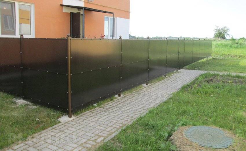 Несмотря на разнообразие вариантов, чаще всего встречается забор на металлическом каркасе. Такая популярность объясняется простотой монтажа и бюджетностью. Вся конструкция состоит из опорных столбов, к которым крепят поперечные лаги. Готовый каркас с внутренней стороны обшивают поликарбонатными панелями. Прочность такого сооружения спорная: металлическая обрешетка обычно делается с большим шагом, а панели легко повредить прямым ударом. Этот вариант отлично подойдет в качестве декоративного ограждения, например, как граница между соседями.