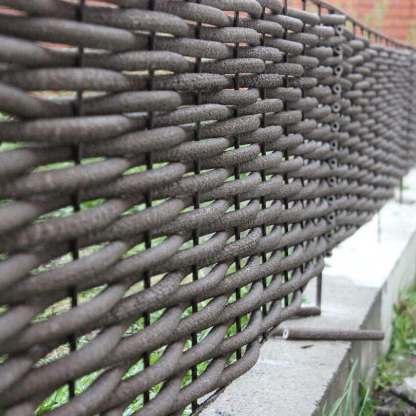 Плетеные заборные секции изготавливаются из металлического каркаса, окрашиваются полимерным покрытием и заплетаются полимерной лозой.
