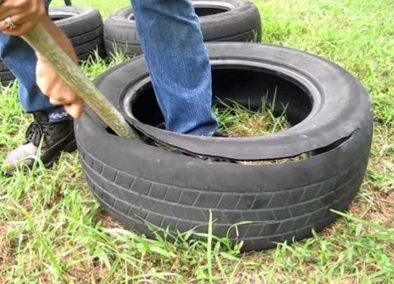 Вообще, изготавливая поделки из шин, их зачастую необходимо резать. Это далеко непросто. Более менее легко можно отрезать боковую поверхность от протектора. Люди с сильными руками и хорошими ножами проделывают это вручную. Хорошая, кстати, тренировка для кистей и всего плечевого пояса. Если уж будете резать ножом, смажьте лезвие солидолом: резина постоянно «заклинивает» металл, а покрытый смазкой клинок хорошо выскальзывает.
