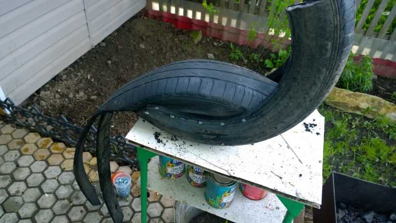 - автомобильная покрышка без металлокорда, протектор предпочтительно мелкий, радиальный; разумеется, поделки такого рода не делаются из новых шин, но все же постарайтесь, чтобы она была не слишком тертой, или хотя бы основная часть была в нормальном состоянии;