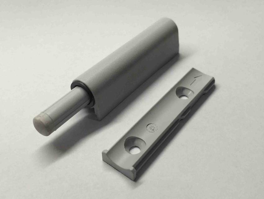 Более упрошенным вариантом накладного доводчика является демпфер. Он не обеспечивает мягкое доведение дверей до закрытого состояния. Изделие просто гасит, смягчает удар фасада о корпус. Демпфер может быть представлен в двух вариантах – амортизатором или отбойником. Амортизатор – это силиконовый, масляный или газовый механизм, который крепится к боковой поверхности мебели. Выпирающий элемент способствует смягчению удара. Отбойник, имеющий вид врезной или накладной конструкции, представлен силиконовой прокладкой, которая, принимая на себя удар, приглушает звук.