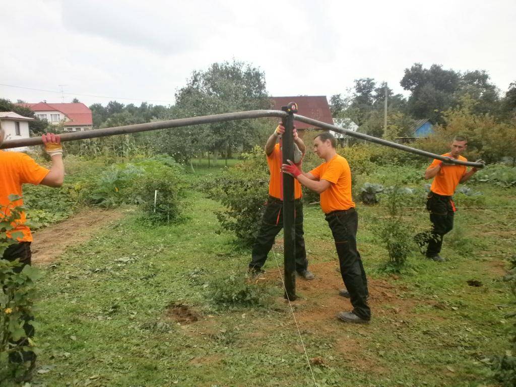 Вкручивать опору в землю нужно двум рабочим