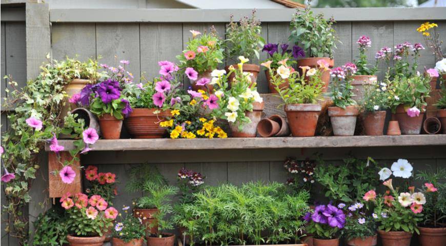 Полки для растений на заборе (фото: www.shutterstock.com/ru/g/Sergey+V+Kalyakin)