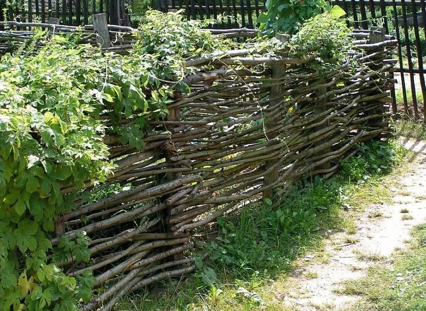 Плетень формируется из гибких прутьев, сплетенных друг с другом и закрепленных опорами. Такая ограда прекрасно впишется в этнический стиль оформления.