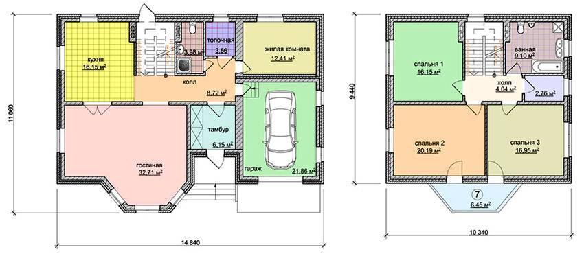 Проект №7. Простой одноэтажный дом с функциональной планировкой предназначен для семьи из пяти человек. Простая форма дополняется эркером и балконом. Вход через прихожую ведет в холл, где расположены лестница на мансарду и двери во все помещения первого этажа: гостиная, санузел, кухня и детская. На мансардном уровне – три спальни, просторная ванная комната, а также две гардеробные, одна из которых примыкает к большой спальне.