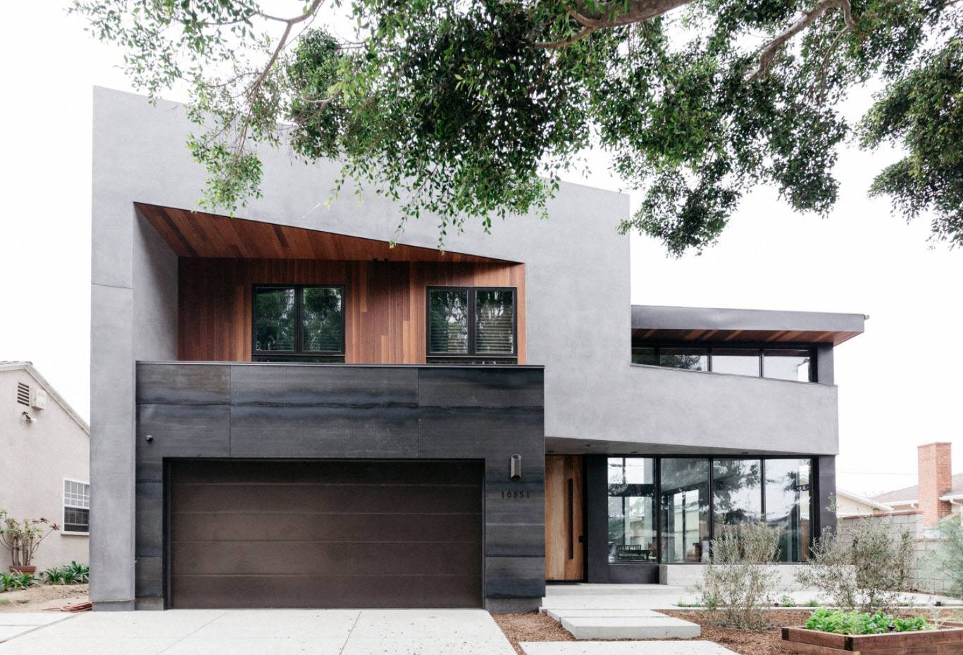 - Гараж несколько выдвинут вперед относительно фасада здания. Благодаря этому вход в дом представляет собой небольшую крытую террасу;