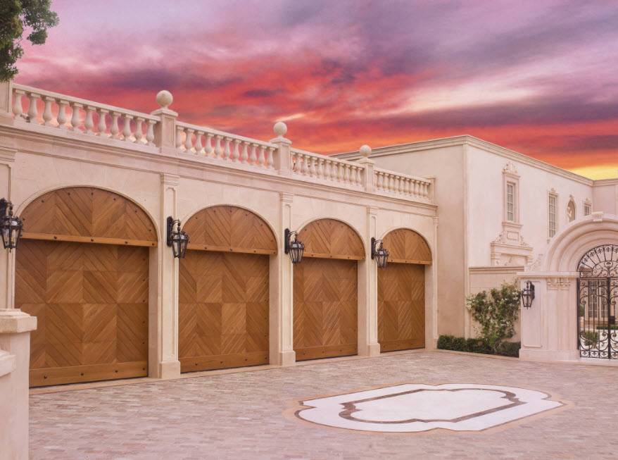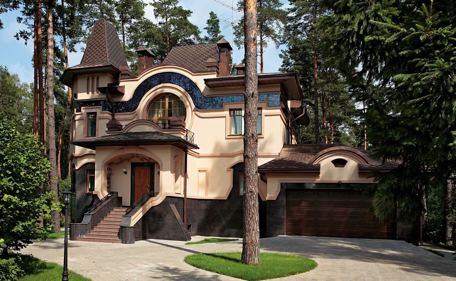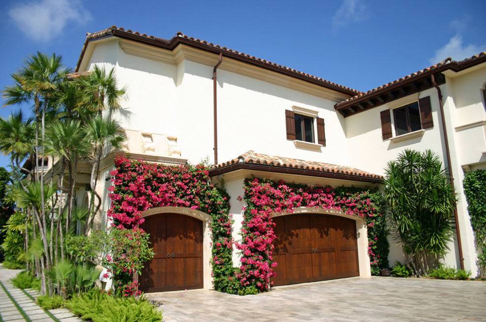 Стилю модерн свойственны новые материалы с уникальной декоративностью, например, натуральные камни, цветные металлы, яркое стекло. Правда обойдётся такой вариант недёшево, но гараж в него можно вписать в любом варианте.
