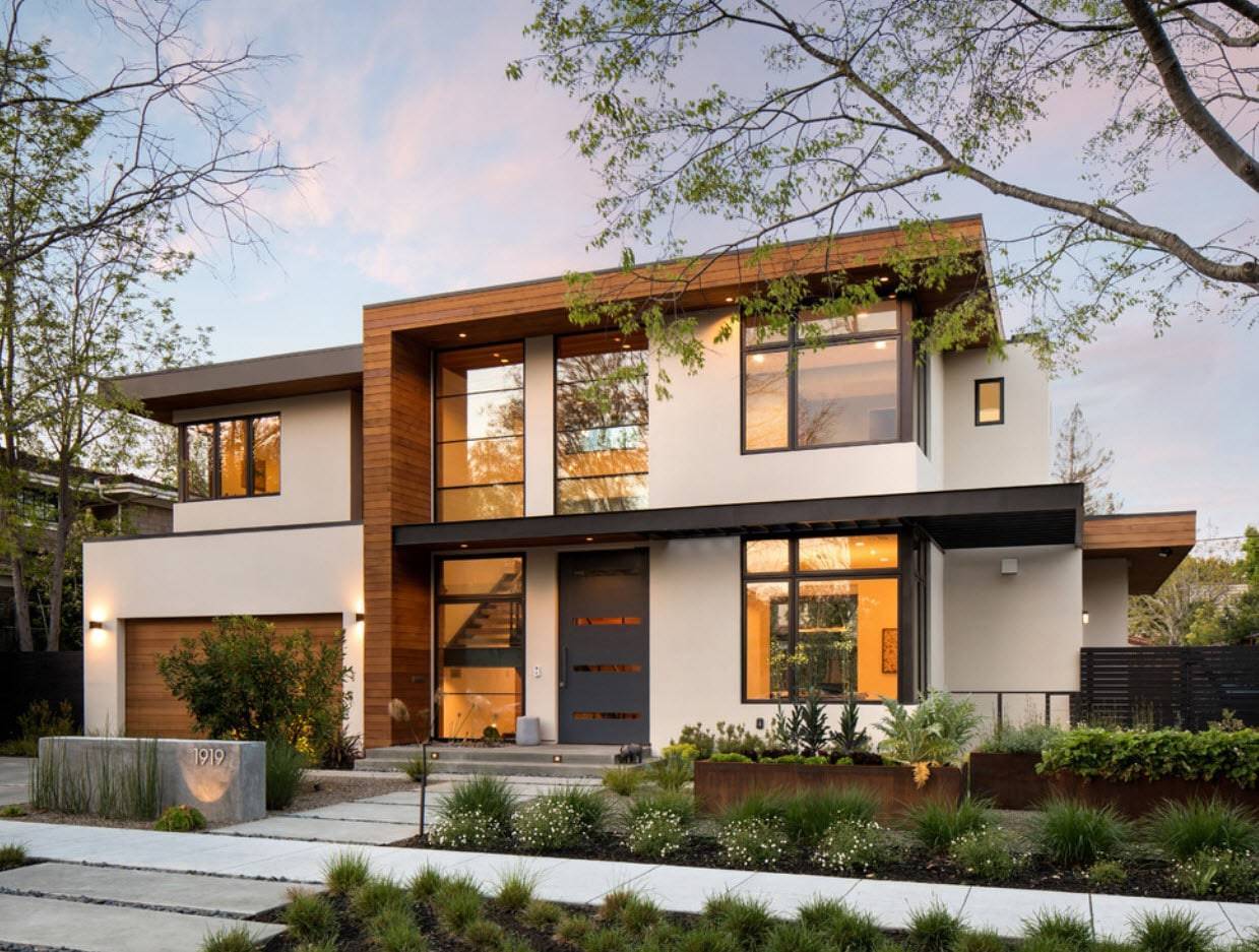 Дом в стиле модерн – характеризуются плавными линиями, напоминающими перетекающую волну. Если вы решили построить загородный коттедж в этом стиле, следует очень гармонично вписать его в свой участок, и хорошо продумать о том, какой будет ваш сад.