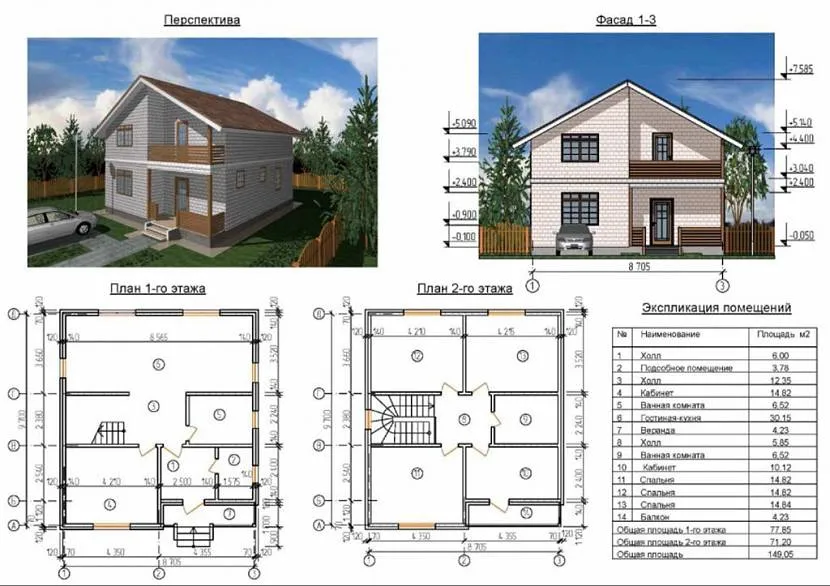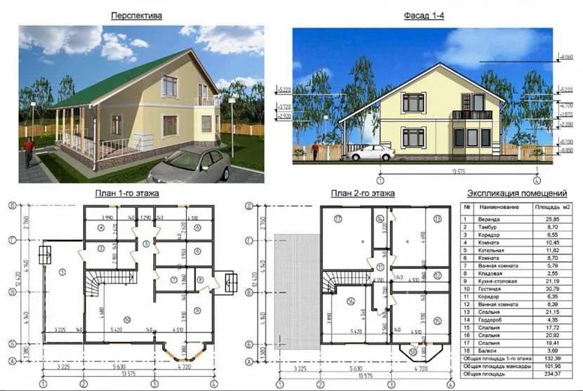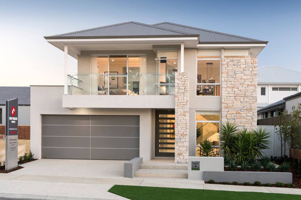 Пример шикарного, просторного дома для удобного размещения большой семьи из 5 человек и вместительным гаражом, предназначенного для двух автомобилей. Общая площадь постройки составляет 201 кв. метр.