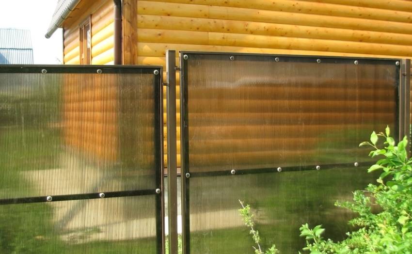 Ограждение из листового полимера очень похоже на забор из плоского шифера (на металлический каркас монтируются листы и дополнительные элементы), но конструкция имеет особенности: