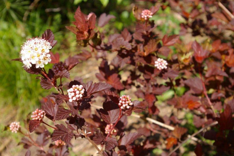 - пузыреплодник Рэд Барон, высотой до 2 м с трех-пятилопастными овальными, голыми, зубчатыми по краю листьями длиной до 7 см роскошного темно-красного цвета, которые немного уже, чем у Диабло, выглядит очень эффектно, а белые с розовым оттенком цветки в зонтиках диаметром до 5 см делают его еще более нарядным. Украшают кустарник и красные плоды, состоящие из 3-5 остроконечных мешочков. Это один из самых ценных сортов пузыреплодника;