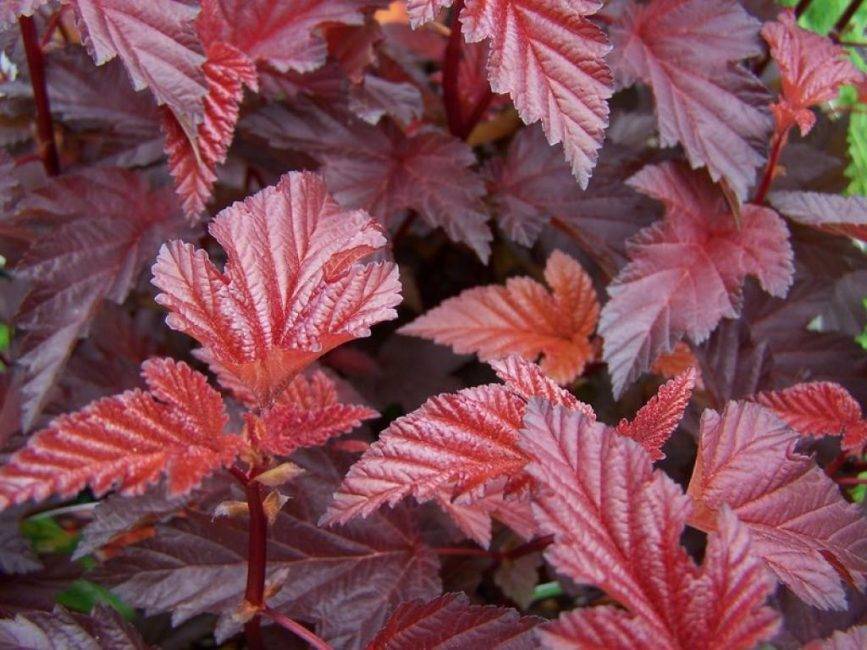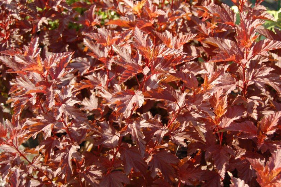 - пузыреплодник краснолистный, или пузыреплодник Диабло представляет собой кустарник высотой до 3 м с темно-красными или пурпурными листьями. Посадка пузыреплодника Диабло и уход за ним абсолютно соответствует нашим рекомендациям с поправкой на то, что при выращивании на ярком солнце листья у него красные, а в тени зеленые с пурпурным оттенком. Характерно, что с наступлением осени цвет листьев не меняется. Это самый востребованный сорт пузыреплодника калинолистного;