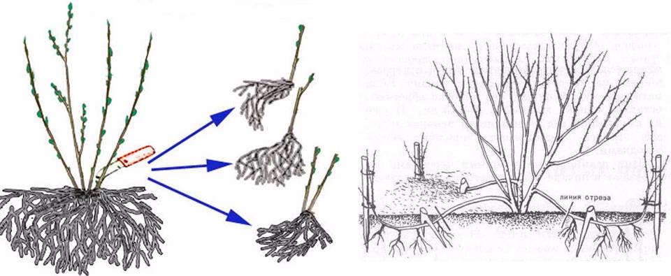 Отводки обычно делают весной или в начале лета, чтобы к холодному сезону они успели хорошо укорениться. В качестве отводка выбирают здоровый и сильный побег, с которого удаляют все листья, за исключением верхушечных. Побег присыпают землей, затем пришпиливают. До получения нового молодого саженца почву вокруг отводка нужно регулярно увлажнять. В конце осени молодые растения отделяют от материнского и высаживают на постоянное место. На зиму неокрепшие кустики нужно укрывать.