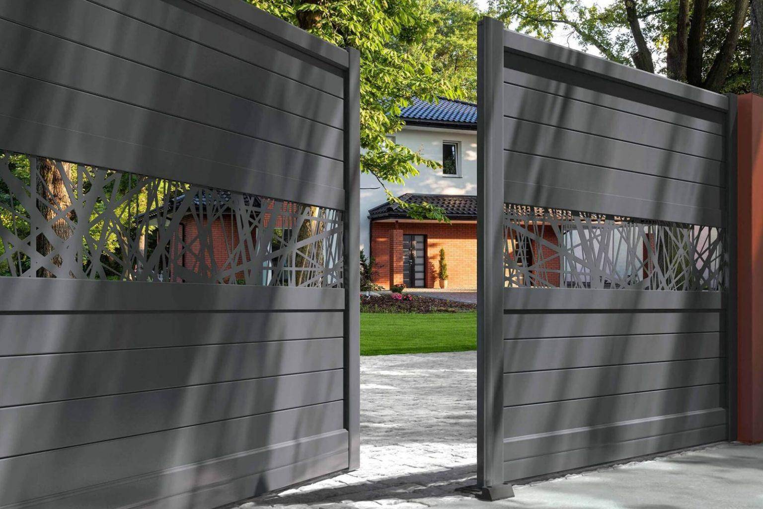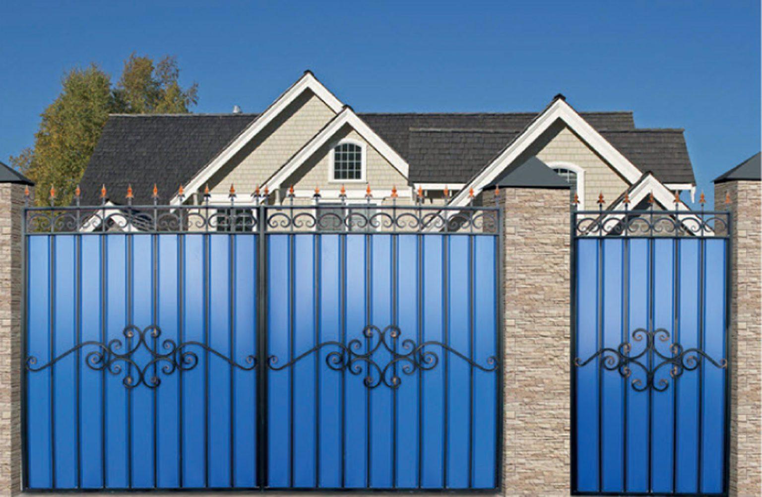 Решая из чего будут сделаны створки, учтите важный нюанс: закрывает ли материал вид на участок? И хотите ли скрыться от посторонних глаз? Если сквозной обзор — преимущество, подойдет штакетник или ковка. Глухие створки изготавливают из досок, древесно-полимерного композита, профнастила, либо «подкладывая» под ковку листы металла или поликарбоната.