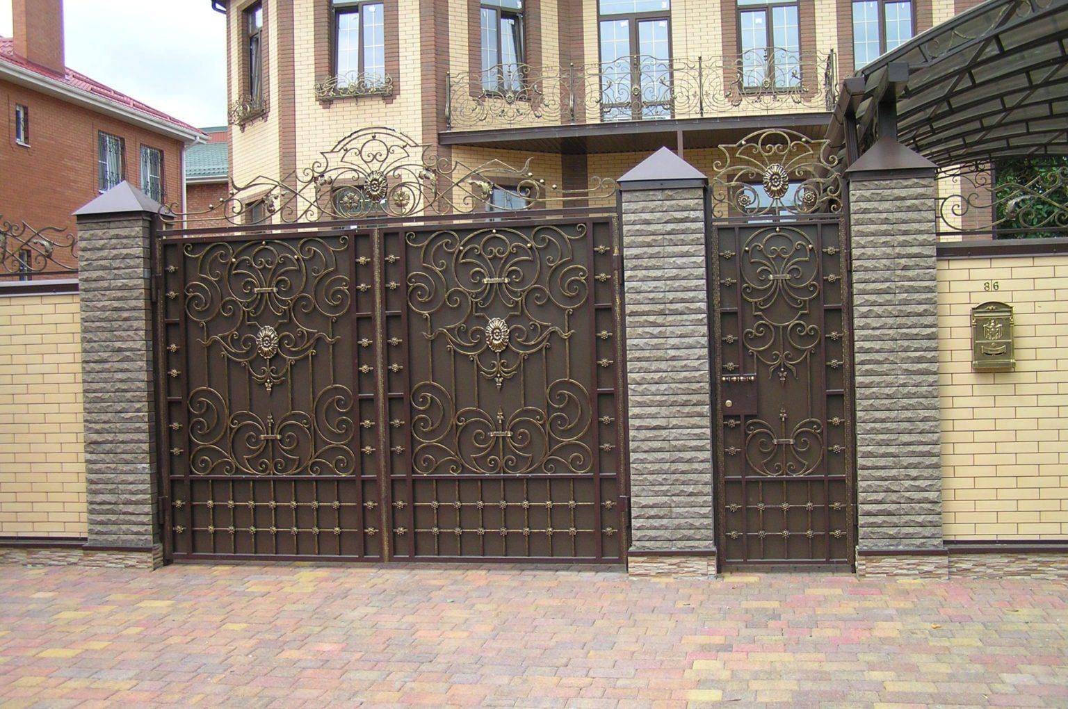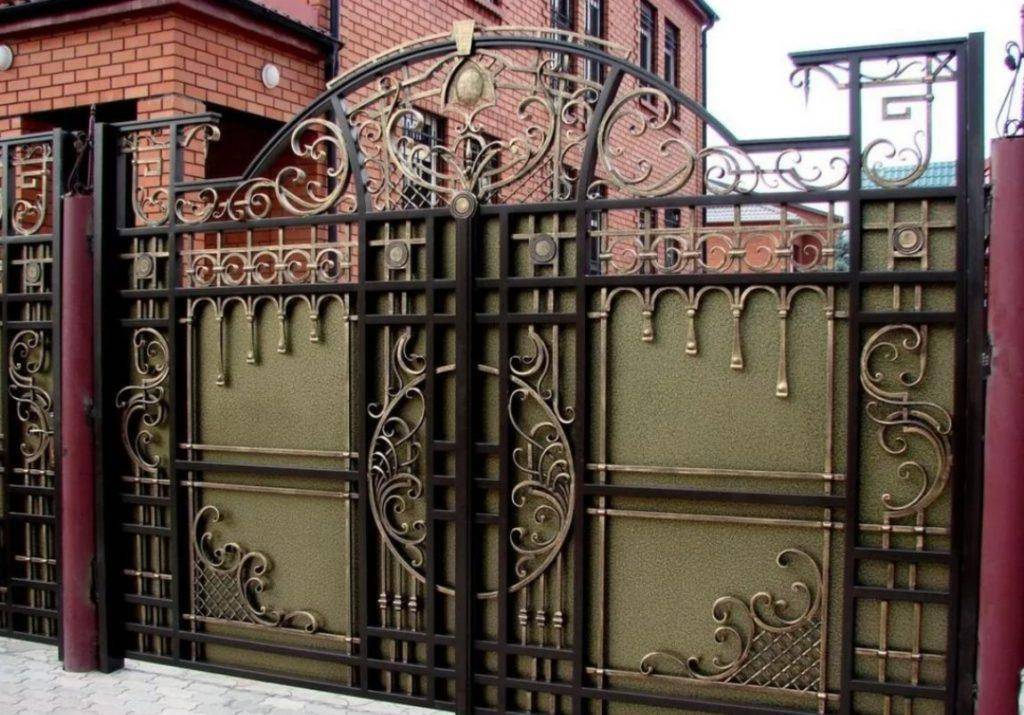 - С коваными элементами. Они будут смонтированы поверх листа. Тем самым она превратиться из преграды для входа во двор в произведение искусства.