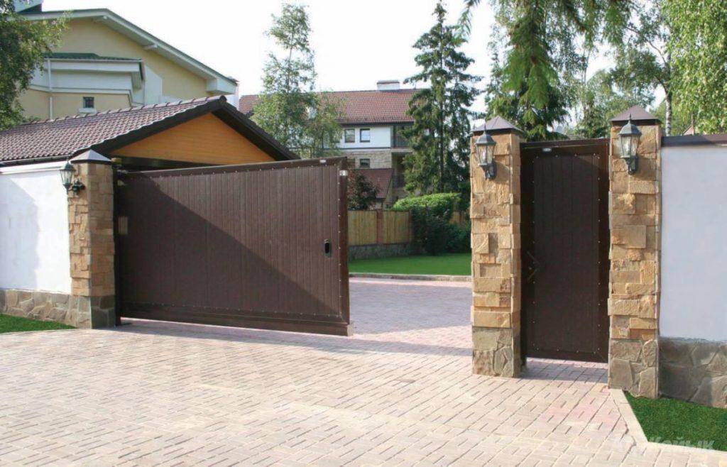 Распашные ворота и калитка из металла со столбами из декоративного камня