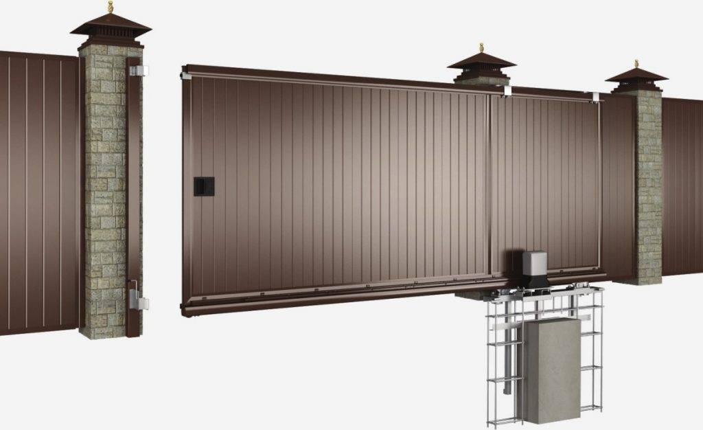 Распашные ворота используют двигатели, закрепленные на статических опорах, столбах или в земле. У них есть рейка, которая соединяет их с полотнами. Мотор перемещает конструкцию, которая толкает или тянет объект в нужную сторону.