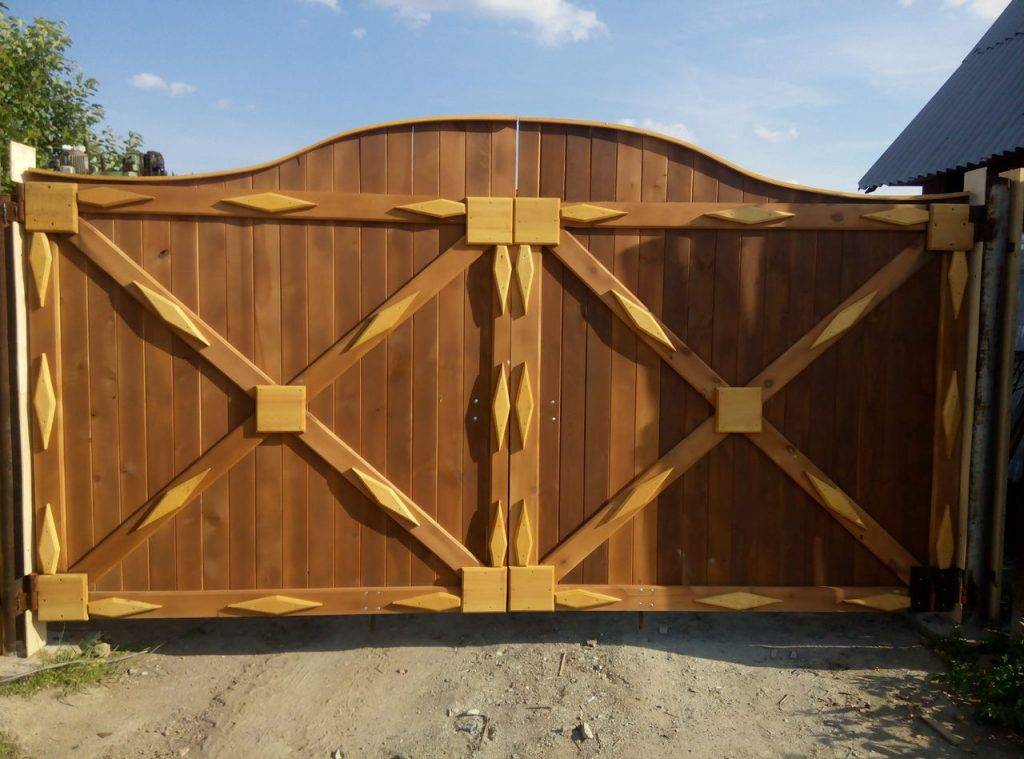 Зачастую ворота делают распашного типа с несколькими створками. Основной материал – сосна. Это дерево имеет малый вес, не подвержено воздействию окружающей среды. При составлении схемы необходимо правильно совместить все составляющие каркаса и конструкции в целом. Иначе в последующем может возникнуть проседание и перекос.