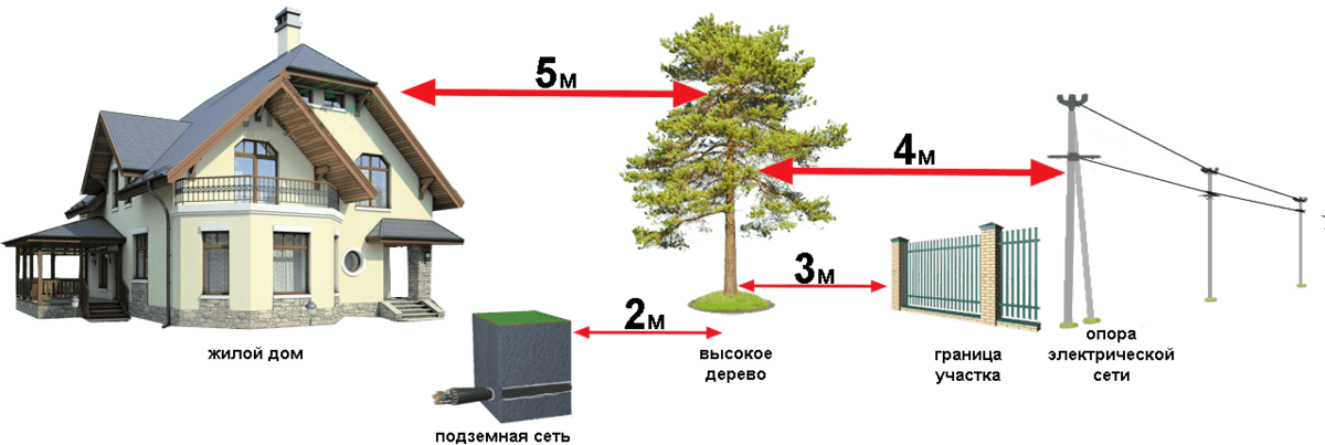 При определении места высадки растения на положенном удалении от забора важно учитывать и их расстояние до других находящихся на участке объектов