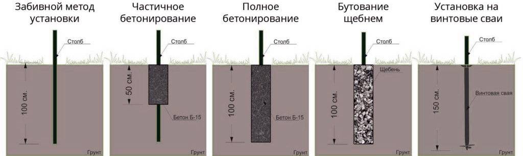 Помимо определения величины заглубления стоек, не менее важно правильно закрепить их. В зависимости от эксплуатационных условий существует несколько способов
