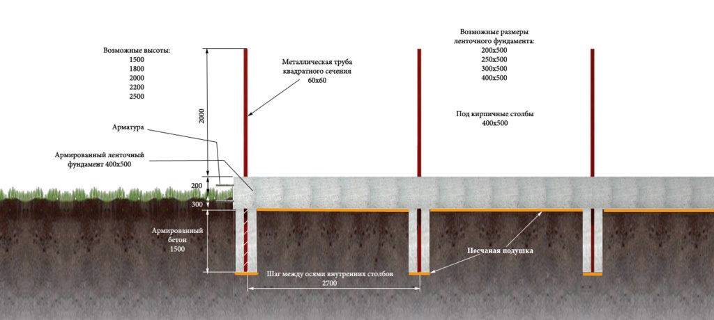 При сооружении тяжелых кирпичных заборов и при монтаже ограждения на нестабильном грунте рекомендован ленточный способ крепления опор. По всему периметру участка роют траншею. В ее дно вбивают арматуру на расстоянии в полметра. Далее делают сухую подушку, сверху помещают арматурную решетку, соединяя ее сваркой с опорами. После вся конструкция бетонируется.