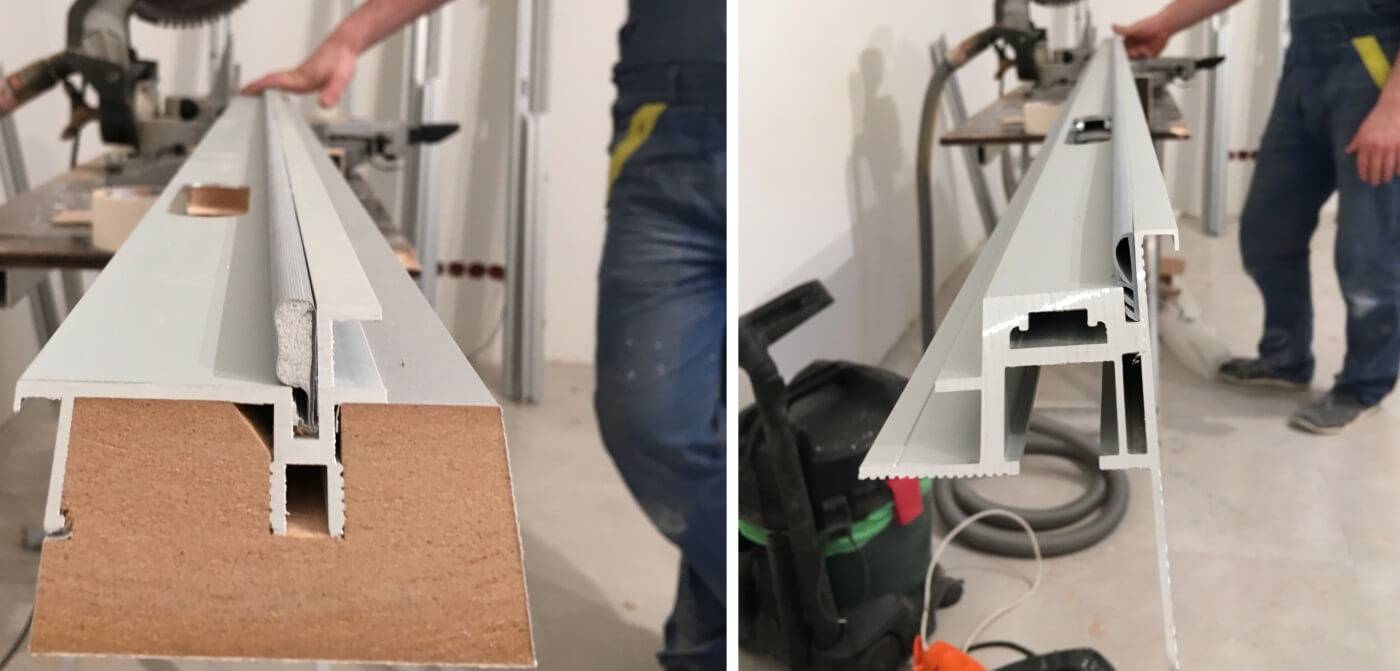 Из-за особенностей конструктива необходимо проштробить дверной проём с лицевой стороны по периметру в ширину 40-60 мм (в зависимости от ширины проёма) и в глубину 10 мм. В него утапливается широкое крыло короба до соотношения уровня переднего паза с поверхностью стены.