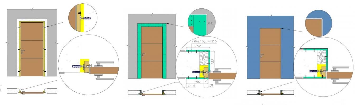 Короб устанавливается в одну плоскость со стеной по переднему канту. Если рядом располагаются несколько дверей, то нужно учесть соотношение полотен по верхнему уровню.