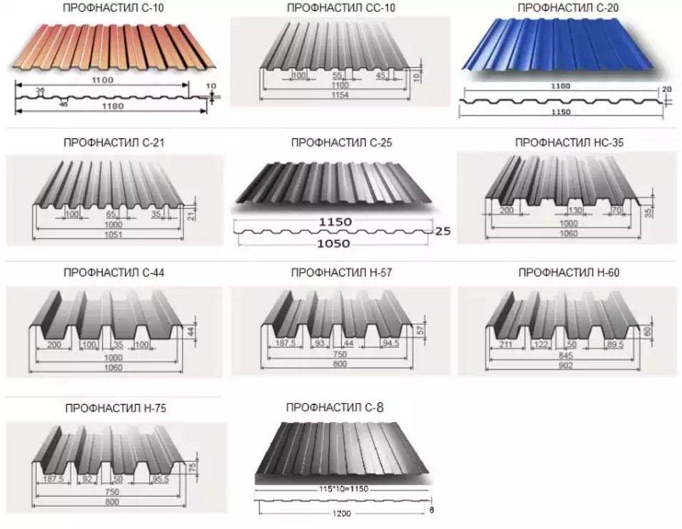 Такое покрытие неспроста называют многофункциональным строительным материалом. Все дело в наличии разных видов, которые отличаются по условиям применения, форме профиля и толщине металла. Варьируется толщина металла в профлисте от 0,35 до 0,9 мм, а ширина – от 600 мм до 1150. В заводских условиях высоту волн делают от 20 до 130 мм, о чем и говорит специальная маркировка на упаковке. Длина листа чаще такая, какую предпочитает конкретный производитель или специально заказывает покупатель.