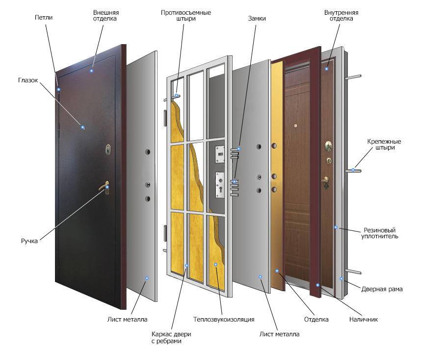 Каждая металлическая дверь состоит из нескольких листов стали. Между такими полотнами устанавливаются ребра жесткости, которые делают конструкцию крепче.
