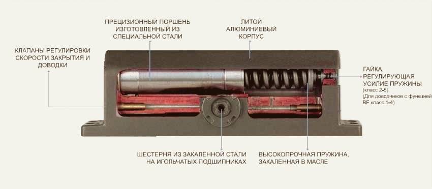 Работа доводчика аналогична работе автомобильного амортизатора.