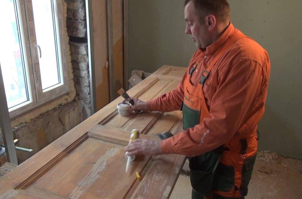 В случаях, когда на двери присутствуют значительные выбоины, в них можно уложить кусочек древесины и затереть его шпателем. Способ позволит сэкономить на материалах – пробка надежно зафиксируется в небольшом количестве раствора.