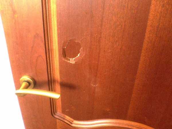 В случаях, когда на двери присутствуют значительные выбоины, в них можно уложить кусочек древесины и затереть его шпателем. Способ позволит сэкономить на материалах – пробка надежно зафиксируется в небольшом количестве раствора.
