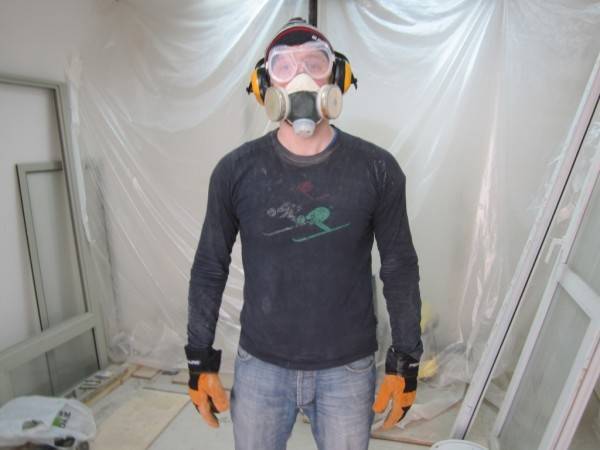 Так как работа предстоит довольно пыльная, проводить ее лучше в мастерской. Если такой возможности нет, накройте пленкой всю мебель и пол в комнате. Позаботьтесь о защите органов дыхания от мелких частичек материала, на глаза наденьте строительные очки.