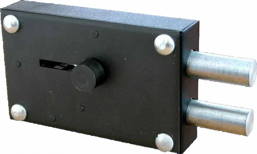 Такие гаражные замки самые простые, поэтому, как правило, устанавливается именно на гаражных воротах. По своему устройству они не сложнее чем почтовые замки – внутри присутствует всего лишь четыре элемента, пружину, рейку (может быть две), корпус и ключ. Конструкция предполагает, что ключ, вставляемый в замочную скважину, будет тащить за собой рейку, поэтому вряд ли это бесшумные замки.