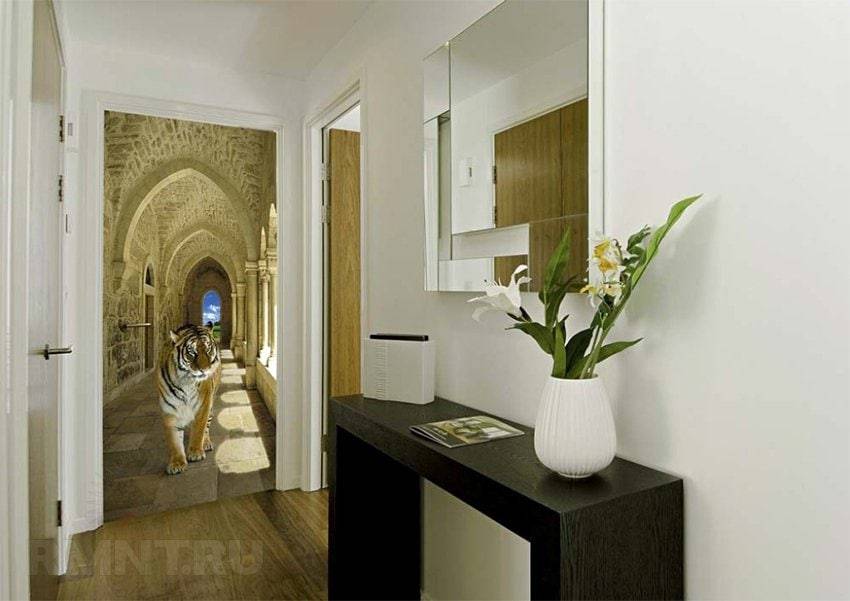 Фотообои на двери помогут за счёт увеличившейся панорамной перспективы сделать небольшую комнату визуально больше. А наклеить их очень легко, для этого даже не нужно снимать дверь с петель