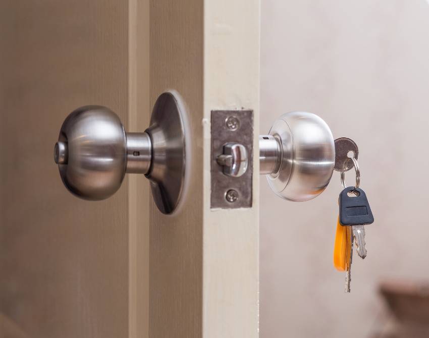 Чтобы произвести монтаж дверной ручки с замком в деревянную дверь, необходимо: